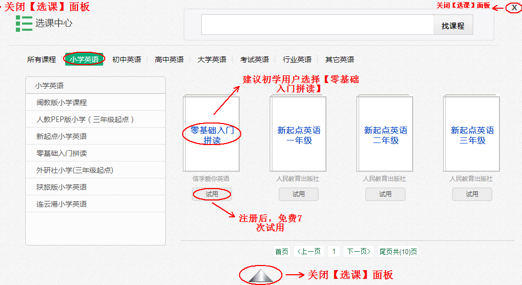 进入系统后,点击 “选课”按钮,进行选课,如果您是英语初学者,小学或初中生,建议您可以从《零基础拼读入门》。 《零基础拼读入门》所在位置:小学课程 =>《零基础拼读入门》; 点击《零基础拼读入门》课程下面的“试用”按钮,进行试用; 选课成功后,点击 选课页面右上角 黑色叉图标(如图所示) 关闭选课页面。