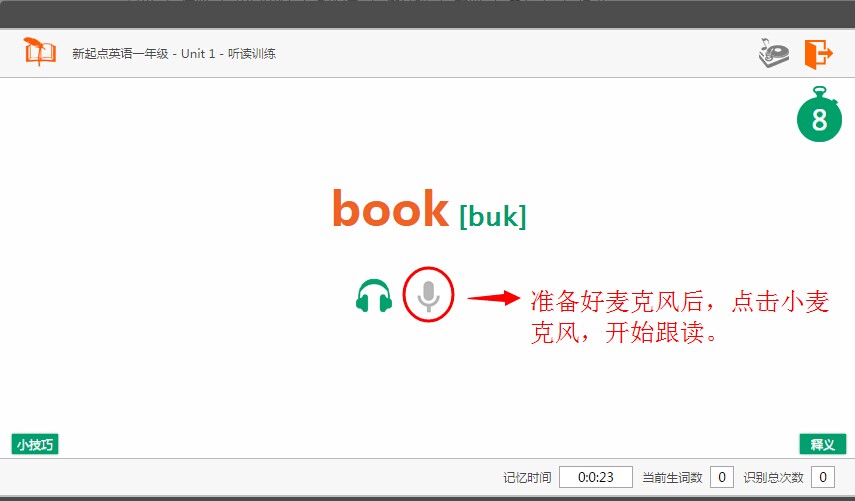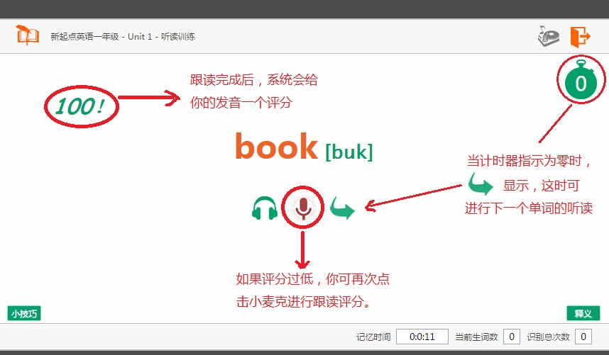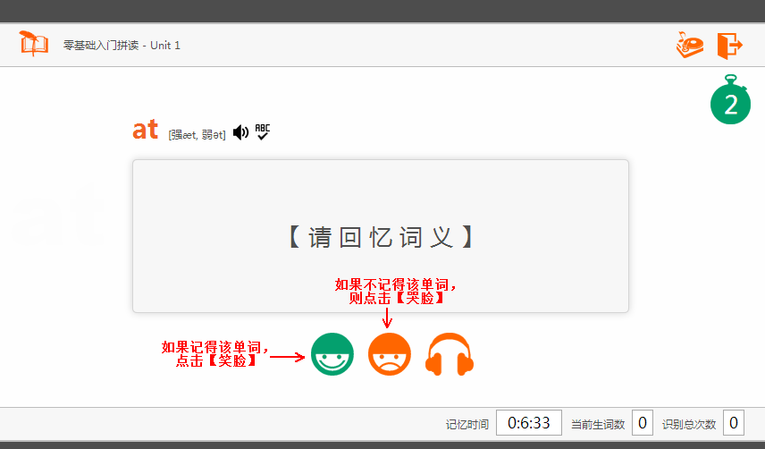 在做智能记忆时 系统会给出一个单词和读音,请在5秒钟倒计时时限内 快节奏大声跟读2遍单词,不停顿直接说出词义。